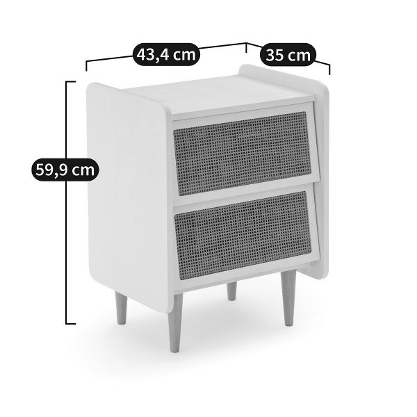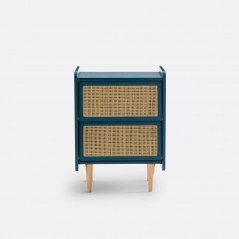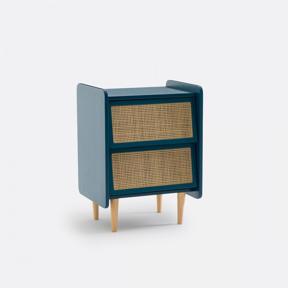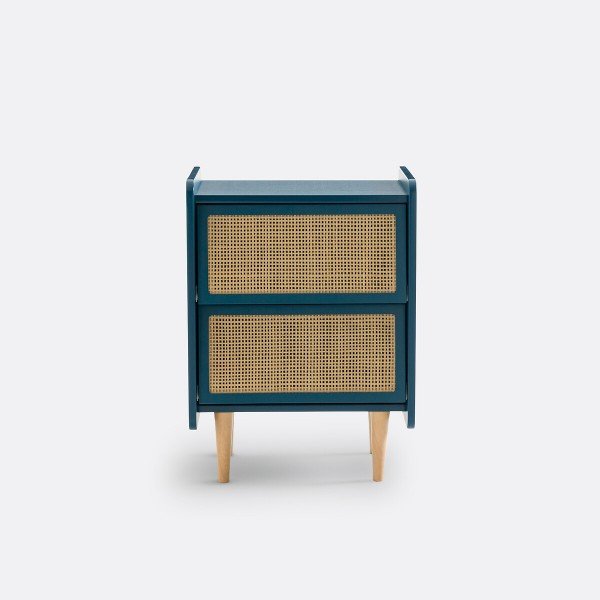 Madera industrializada con laca semi mate y cajón con correderas de extensión y ratán. Estructura de madera de pino macizo. Los tonos pueden variar según ajustes de tu equipo o monitor.