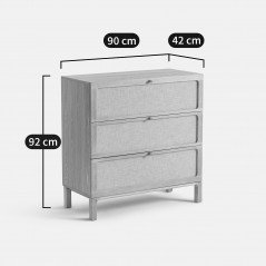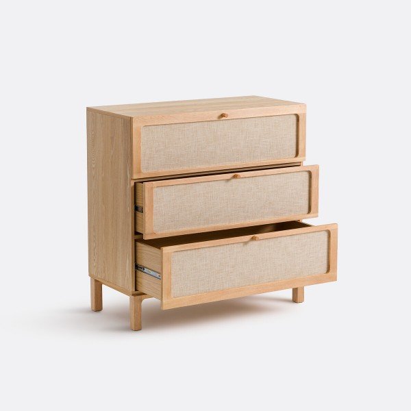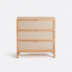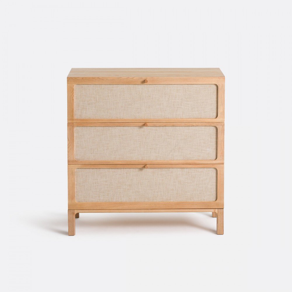 Regina - Cajonera estilo clásico con madera de encino y tela tono natural con 3 cajones