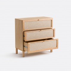 Madera industrializada con chapa de encino con barniz natural. Puertas con ratán tono madera. Estructura de madera maciza de pino con barniz tono encino. Los tonos pueden variar según ajustes de tu equipo o monitor.