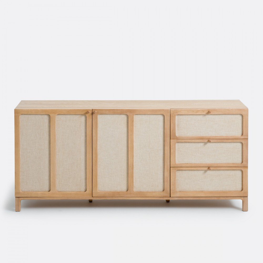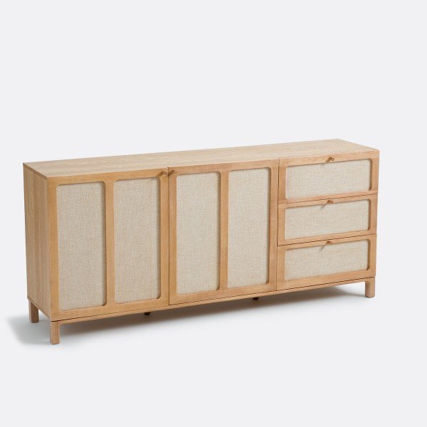 Regina - Credenza estilo clásico con madera de encino y tela tono natural con 2 puertas y 2 cajones