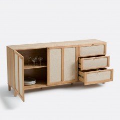 Madera industrializada con chapa de encino con barniz natural. Puertas y cajones con ratán tono madera. Estructura de madera maciza de pino con barniz tono encino. Cajones con extensiones. Los tonos pueden variar según ajustes de tu equipo o monitor.