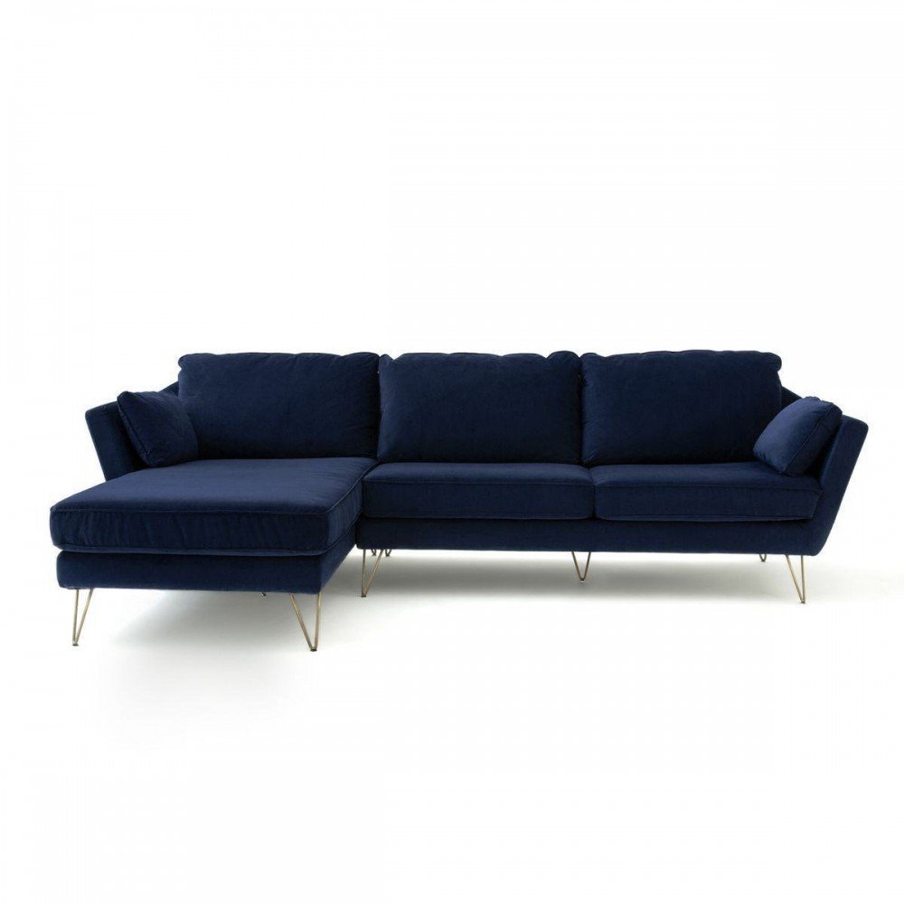 Duque - Sofá esquinero estilo moderno pies de horquilla dorada terciopelo color azul royal