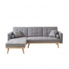 Nelly - Sofacama esquinero estilo escandinavo tela gris claro y con tira de madera