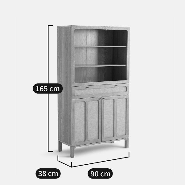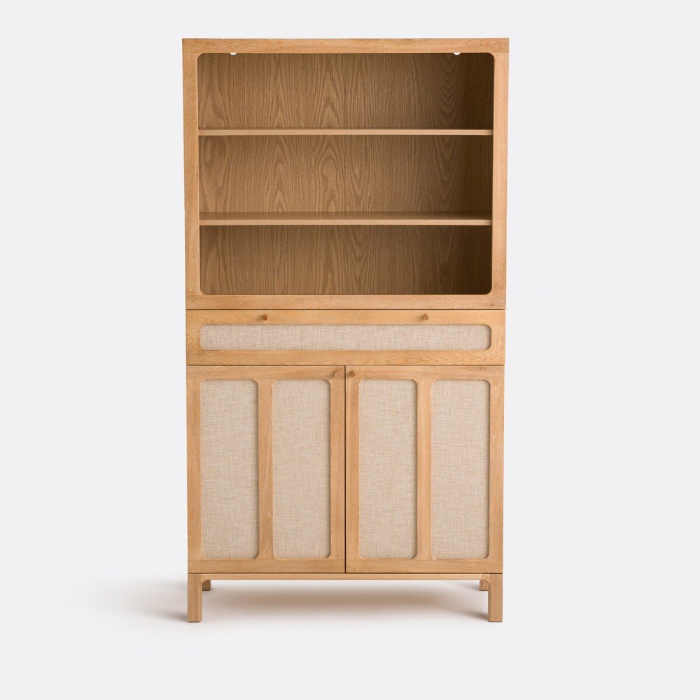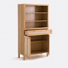 Madera industrializada con chapa de encino con barniz natural. Puertas y cajones con ratán tono madera. Estructura de madera maciza de pino con barniz tono encino. Cajones con extensiones. Los tonos pueden variar según ajustes de tu equipo o monitor.